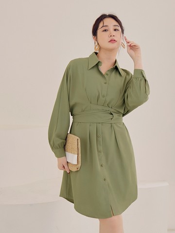 層次感腰間抽繩長版襯衫 /鼠尾草綠