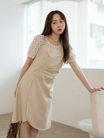 不易皺假兩件細肩帶抓皺短洋裝
