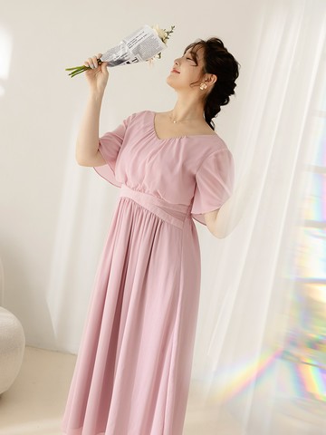 純色棉寬松法式 泡泡袖長連衣裙/洋裝