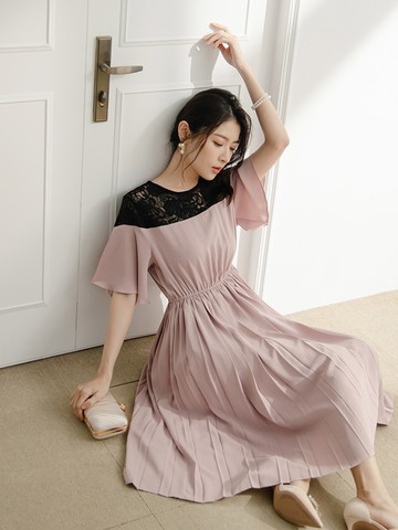 圓領壓褶收腰綁帶寬鬆長洋裝