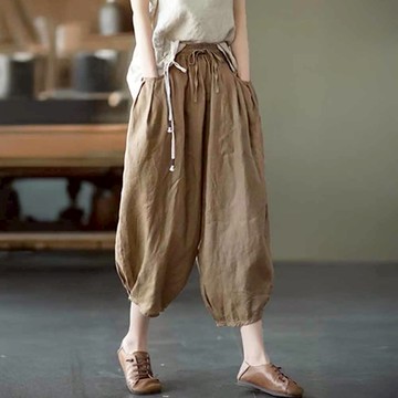 棕綠棉麻半松緊束腰大廓形直筒口袋休閒百搭闊腿長褲 杲果GAOGUO