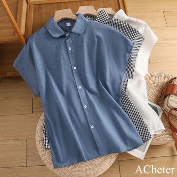 【ACheter】純棉圓領設計感寬鬆小飛袖棉麻襯衫短版上衣# 121829(現貨+預購)