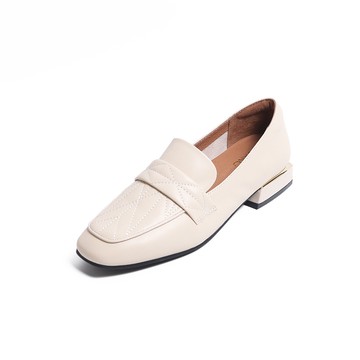 [獨家訂製楦型]休閒感羊皮拼接造型方頭平底樂福鞋 米色