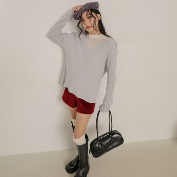 V領坑條寬鬆針織上衣-灰【KT224148】