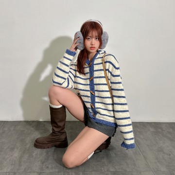 木釦橫條連帽毛線外套-杏藍【KT281087】