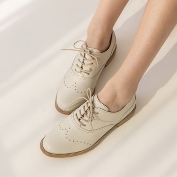 [獨家訂製楦型]全真皮鏤空綁帶尖頭低跟牛津鞋 米白色