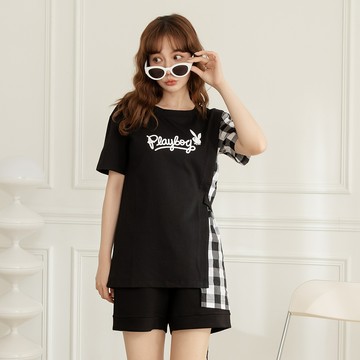 (L) ca ca holic拼布格紋印花珠珠黑色長袖上衣