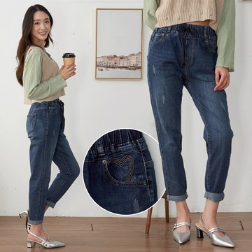 ★【喜芝梅】砂鑽刷色單詞飾繡牛仔褲(藍色;M-2L) 224030613
