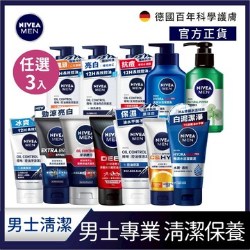 【NIVEA 妮維雅】三入組 男士潔面泥/洗面乳 (深極炭/全效/水活/玻尿酸/積雪草系列) 控油 保濕 抗暗沉