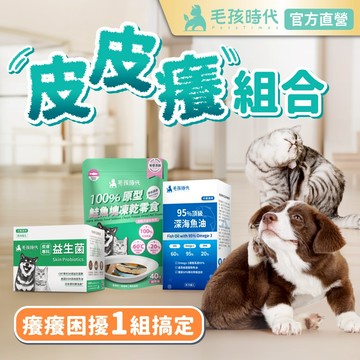 【毛孩時代】皮皮癢組合(皮膚專科益生菌+95%頂級深海魚油+100%原型鮭魚塊保健凍乾)--官方直營