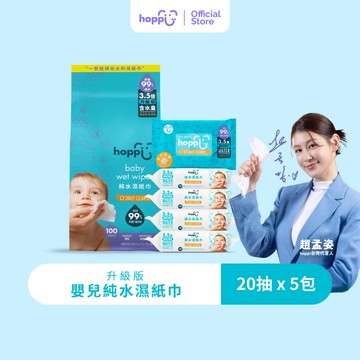 Hoppi純水嬰兒濕紙巾20抽5包1袋 媽媽愛用嬰兒手口濕巾 抽取式加厚純水柔濕巾99%純EDI水適用於敏感肌