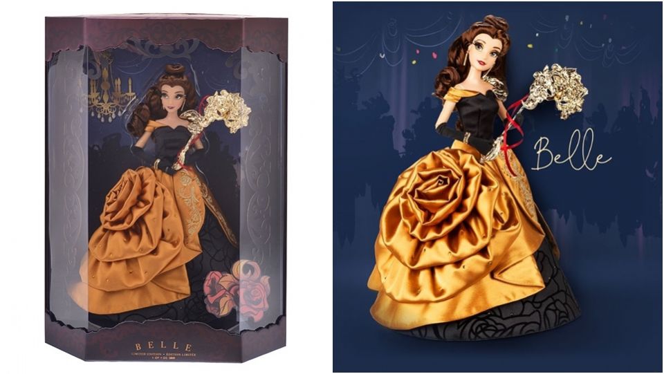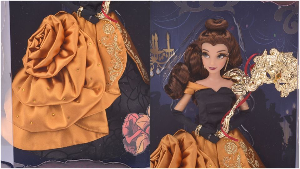 可以看到在裙子的部分迪士尼下了很多功夫,除了精巧的刺繡,黑色內襯裙擺野放上像是花窗玻璃的刻紋!用玫瑰呼應《美女與野獸》的故事場景,皺褶的部份用金黃色的水鑽點綴,搭配特別雕刻的手持面具,就像是回到了中古時期,面具眉心的黃色水鑽透露出貝兒的身分,真的超細緻,絕對值得公主控的你收藏~