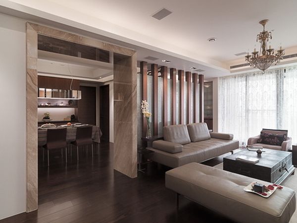 客廳沙發木作玻璃背牆與大石作門框的整體設計。