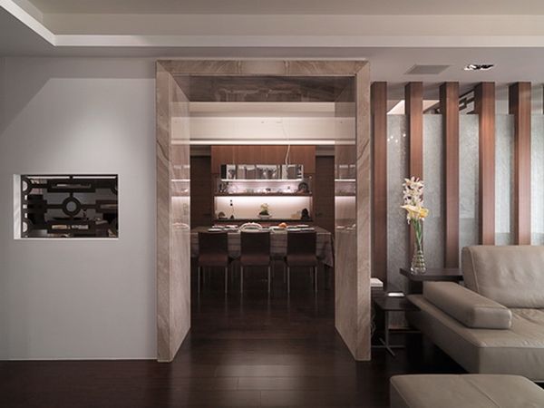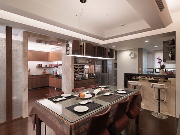 此案的特色在於因屋主的需求,所有的開放空間因而有別於其他個案,一般住宅會將客廳與餐廳做適當地開放且連結,在此屋主特別強調餐廳的使用。餐廳是他們聊天談心的地方,兒子從小在餐桌寫功課,女主人在廚房做飯,做飯與用餐的當下也可討論功課及在校學習情形,餐桌周邊的設備就更加成為考量的重點,例如吧台、咖啡機、酒櫃、置物櫃及餐桌的光線,這些都是餐廳必須整合的完整需求。從客廳到餐廳的動線有一大鋁門框做為動線區隔,再由餐廳連接個臥室的私密空間,女主人的廚房也透過吧台與餐廳開放式地結合。