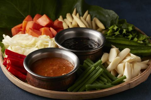 遊走一趟攤販市集,不難發現人手一包蔬果總匯,正是泰國東北著名的「泰式蘸醬蔬菜」,可依照喜好自由拌入高麗菜、小黃瓜、青椒、胡蘿蔔、泰國蛋茄等新鮮配料,搭配兩款特製蘸醬:肉末沾醬及泰式辣椒醬,泰國小吃一定要嚐嚐看。