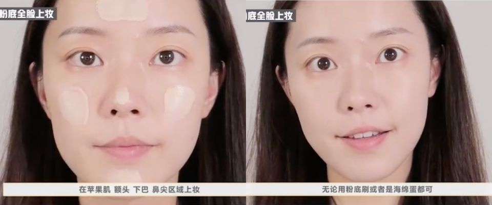 接著,選一款最輕薄的粉底液(建議是潤澤型底妝),將粉底點在蘋果肌、額頭、下巴、鼻尖後,再用底妝工具(海綿或是粉底刷都可以),推開粉底液到全臉。這樣可以預防底妝用量過多,簡單不失敗地拍出薄透底妝。