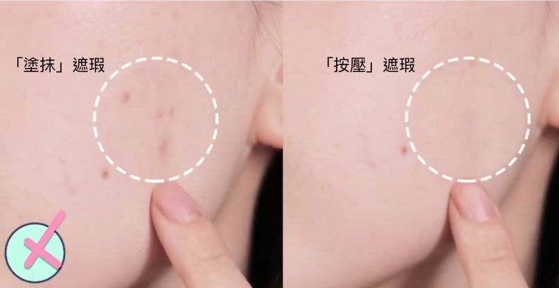 針對重大瑕疵,我們用「按壓、輕點」的方式上遮瑕。圖片可以發現,手法用錯遮瑕效果的差異可是非常大的。