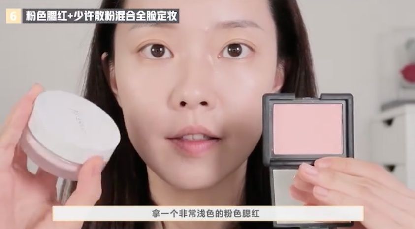 最後這一步是創造嬰兒肌紅潤感的關鍵!選擇一顆淺粉色的腮紅,加上少量的透明珠光蜜粉混合,輕掃全臉做定妝。這樣可以讓整個底妝看起來粉嫩粉嫩的,氣色滿分!