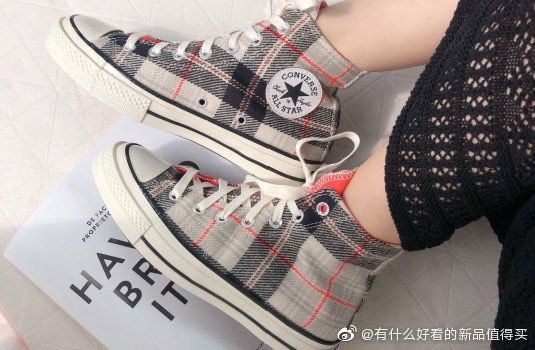 奶油色格紋是文青族必備的一雙converse,不論是褲裝、吊帶褲、裙子、洋裝都能夠搭配,以奶油白色最為基底色,灰色的粗格交錯再以紅色線條增加格紋層次。高筒鞋在冬日還能夠保暖腳踝,今年鞋櫃的必備款!