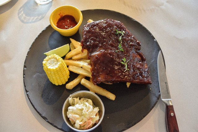 這美式豬肋排份量只是半份而已,份量我就覺得不小呢!美式豬肋排搭配輕辣櫻桃燒烤醬,佐以脆薯、玉米與味道比較偏酸的包心菜沙拉,你們看這豬肋排的橫切面,可以說是骨頭小,旁邊的肉非常多,比起我之前吃過其他豬肋排的大骨頭只有旁邊少少的肉,台北西門町意舍酒店『吃吧』的豬肋排真的吃起來非常滿足~