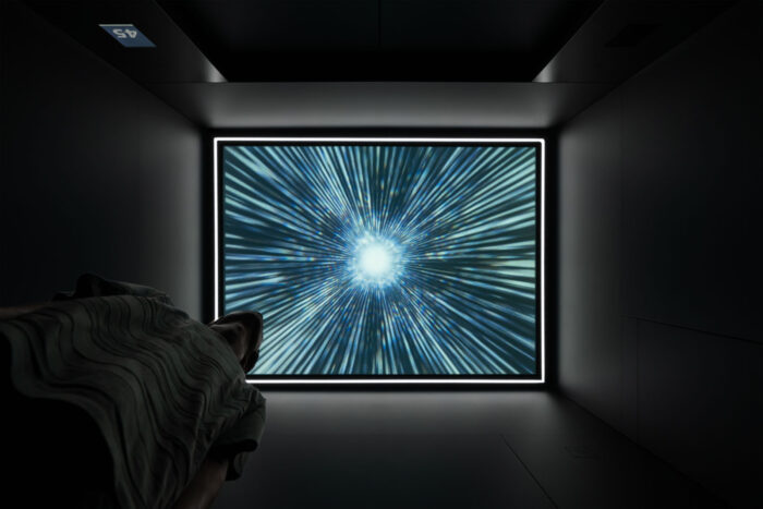數台巨型4K電視拼接出時空之河,到場者只要按下加入,來場記錄便投向螢幕上的時間流。