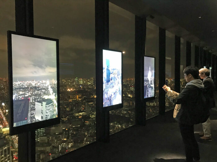 東側迴廊的壁面空間裝設長40公尺的LED螢幕,視覺化呈現澀谷相關各種數據,倒映在對側展望的玻璃窗,顯得有些迷幻。