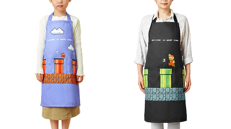 可愛的圍裙包含大人小孩的款式,水管的地方做成口袋,在料理的時候可以隨手收納小東西,不容易顯髒的藍色黑色,還有瑪利歐在你身上跳耀,滿滿的歡樂氣氛!