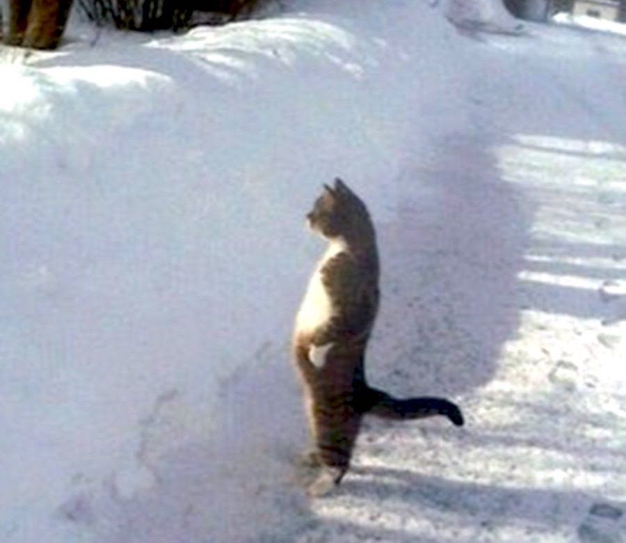 堂堂正正挺直腰桿在路上站著的貓貓,帶著無所畏懼的眼神直視前方,兩手還插著腰,正經八百的樣子超萌的啦!