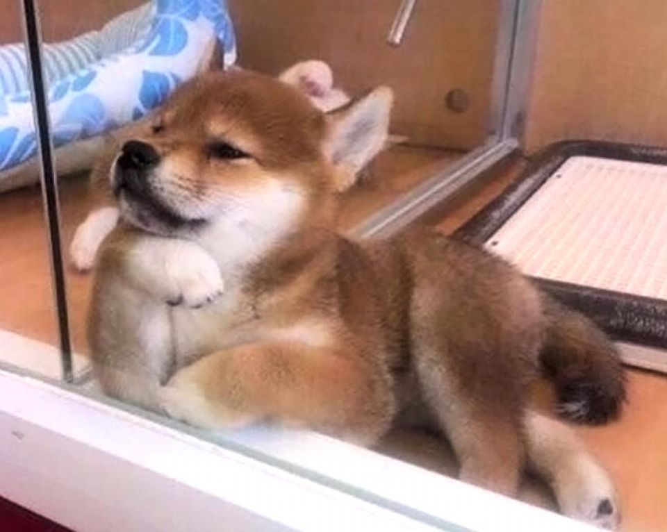 正好趴在玻璃前的柴犬,用手托腮的姿勢加上交叉的後腳真的太逗了~臉上還掛著一副慵懶高傲的表情,就好像自己是王一樣的架勢!