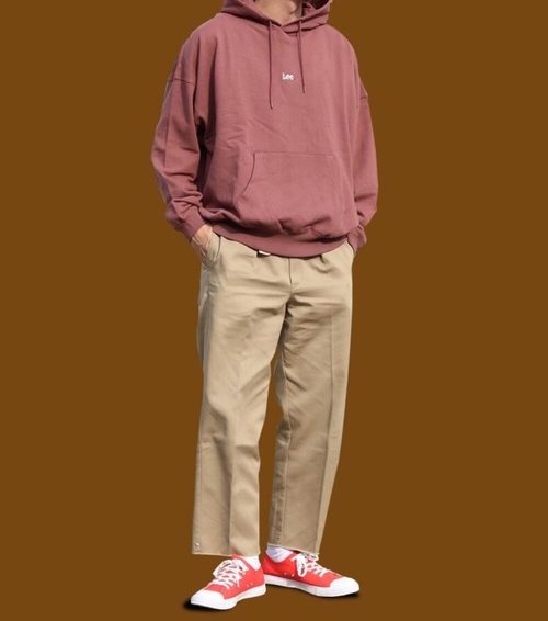 粉色調的穿搭絕對不是女生的專利,男性偶爾也可以在全身穿搭單品中添入一些粉色系,給人留下活潑、擅於顏色搭配的印象。暗粉紅的帽 TEE 搭上卡其褲,,再以橘紅色的鞋款與上身呼應,透過顏色讓這定番組合更加地發揮出個人特色。