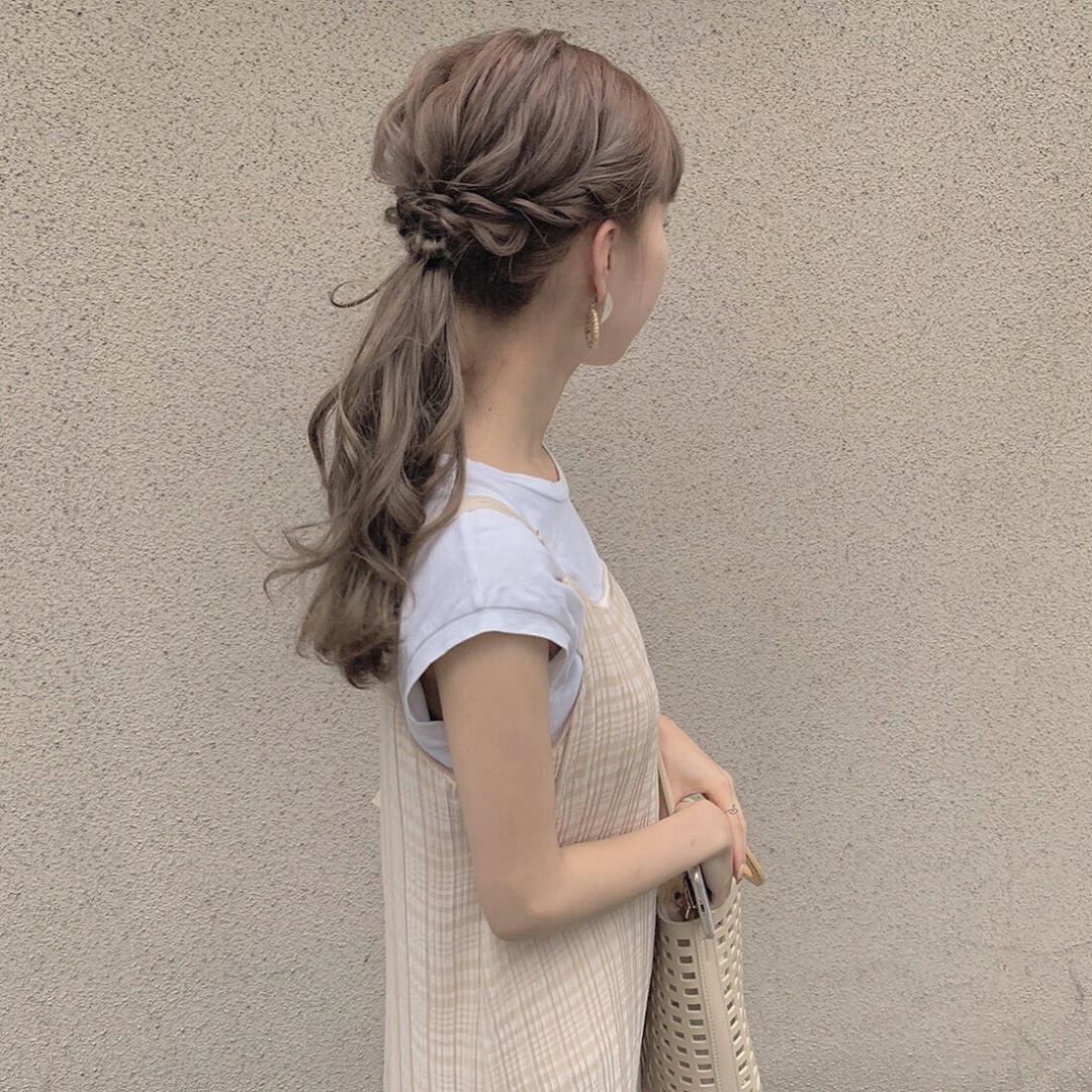 真的嫌基本馬尾太過簡單,可以稍微增加一下頭髮兩側的線條感。求快的話可直接先編上長尾辮,但只需編到脖子後方並用橡皮筋束起就收尾。若希望頭髮線條的細緻度較高,就抓出耳朵旁兩側的頭髮編上辮子,最後再將所有的頭髮綁在一起,並抓出髮流感來完成馬尾。想修飾臉型的話也可留下鬢角兩側的髮束,上些捲度後更能為馬尾髮型呈現出自然面貌。