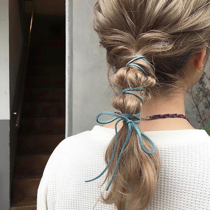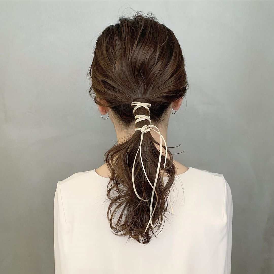 以上 2 種馬尾綁法無論於日常還是特別的日子都相當適用,但想要從中變化出更具印象感的髮型時,線狀或條狀的繫帶、緞帶或是絲巾都是可以利用的裝飾品。只要在完成馬尾後將細帶直接綁在髮束上,或是利用將絲巾與馬尾辮綁再一起,利用髮絲與線條交織的線條打造簡單又相當吸引目光的髮型!有著聚焦感的特色馬尾非常值得在想營造不一樣的造型氣氛下嘗試。