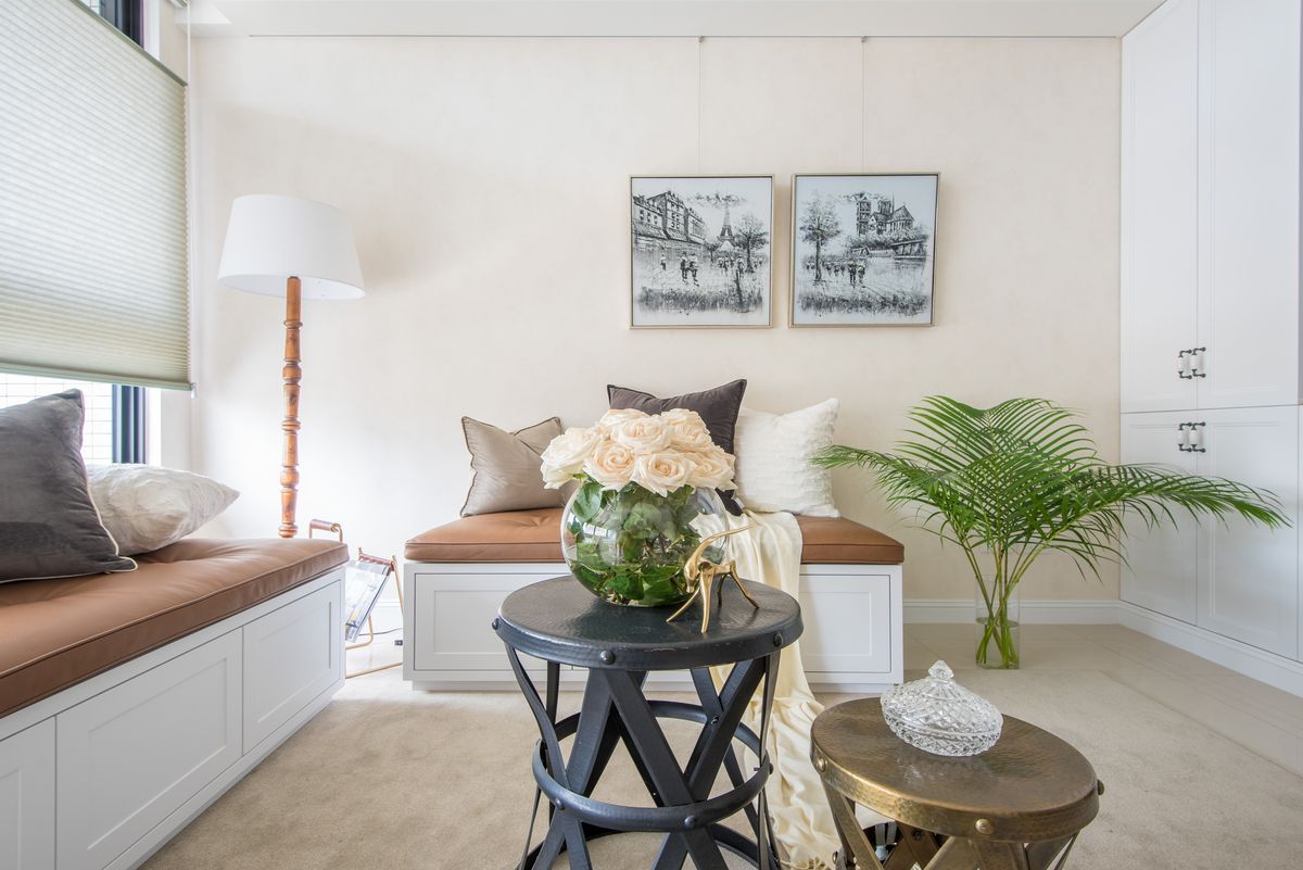 空間上選用素淨沈穩的擺設及配色,更能令人感到放鬆。因此我們將可移動式臥榻作為沙發使用,增加靈活度。朋友來訪時,可以L型排列,開啟整夜的促膝長談,抑或並列而坐欣賞經典影集;獨處時,便可自在躺臥,靜靜享受一本好書帶來的放鬆時光。