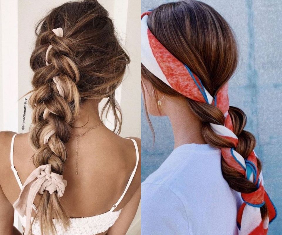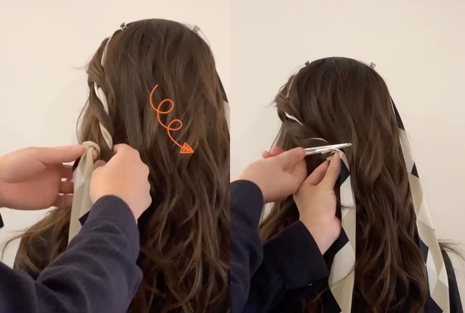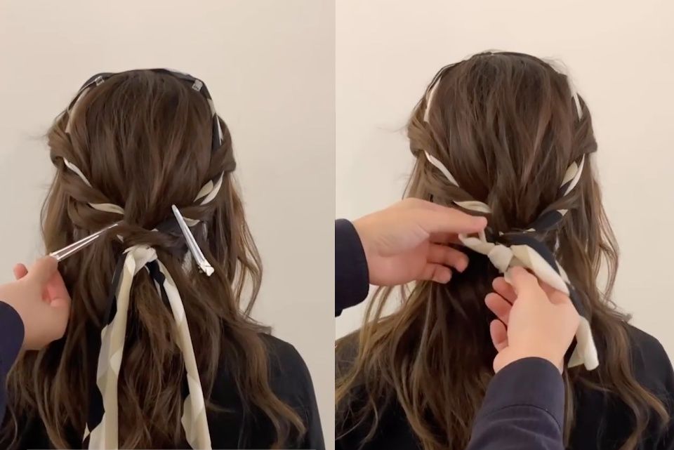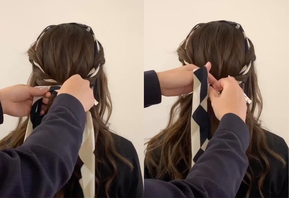 STEP3:兩側都編髮完成後,利用剩下來的絲巾將編髮剩餘的頭髮綁成馬尾。這個步驟比較困難,如果擔心綁不緊會讓髮型散掉、前功盡棄,建議可以用黑色髮圈輔助,把頭髮都綁成馬尾後,再將絲巾在髮圈上打蝴蝶結。