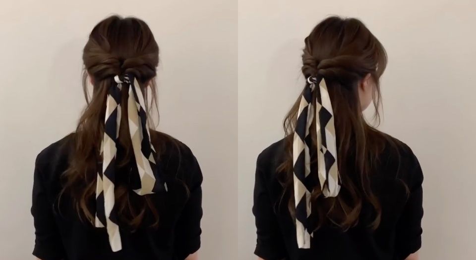 STEP4:最後,把絲巾綁在髮圈上,讓絲巾兩側自然垂下,髮型就完成囉~