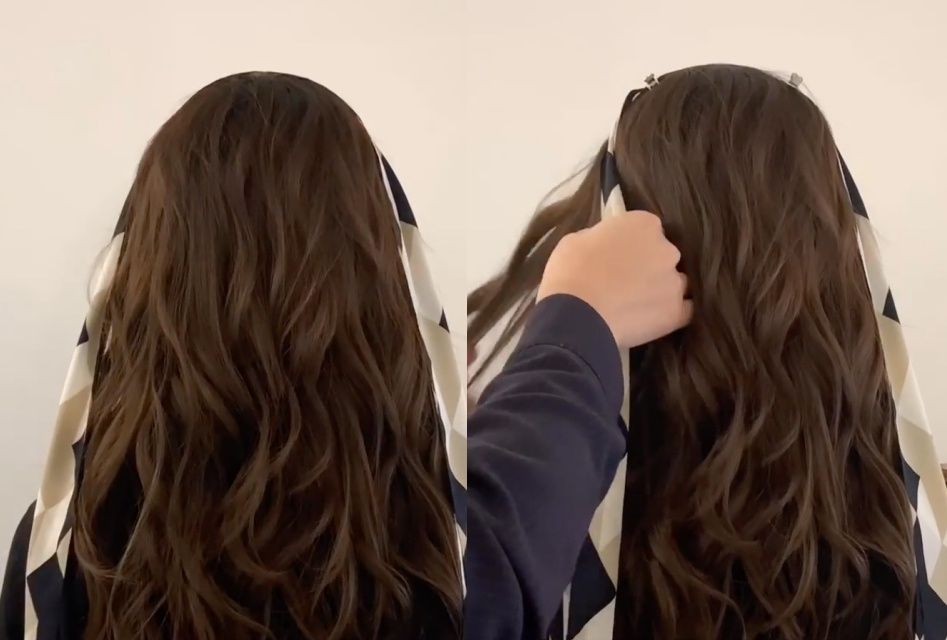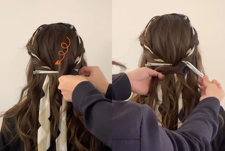 STEP1:將絲巾放在頭上(約頭頂前5公分處),並用兩個髮夾、夾在絲巾左右側,讓絲巾暫時固定。