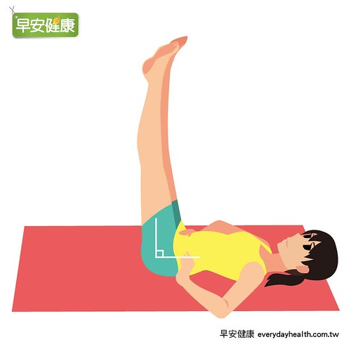 4. 當2、3的動作都做完後,就將雙腿打直並盡量向上抬高伸展,此時仍要用力按住髂骨以保持腰部不離地,若無法將雙腿抬起至90度也無妨。