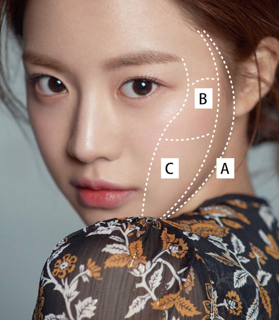 A 是通用的修容區域。如果本身就是小臉、鵝蛋臉,直接將這裡刷上修容色即可。