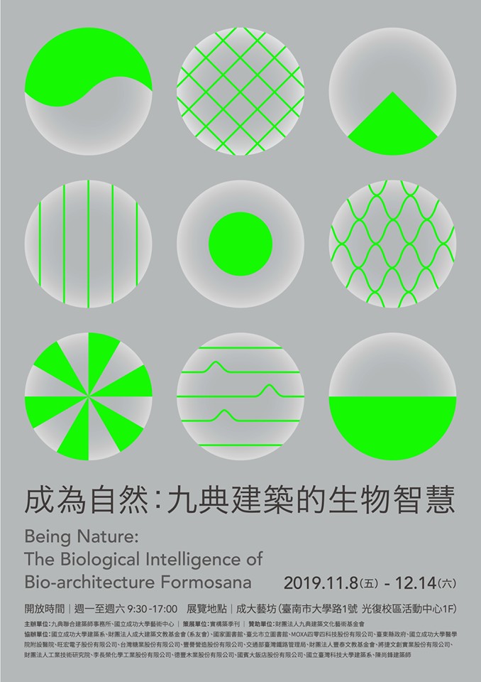由九典聯合建築師事務所及成大藝術中心主辦、王俊雄老師策展及實構築季刊執行「成為自然:九典建築的生物智慧」建築展即日起於成大藝坊盛大展出。共計展出九典建築成立20年來的相關建築作品,完整展現其以「生物智慧」為主軸的建築實踐歷程。