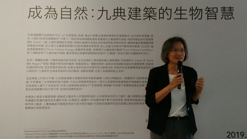 開幕活動在成大藝術中心藝術長馬敏元及成大校長蘇慧貞致詞後正式開始,九典建築張清華建築師開場表示,今年是成大立校88年,也正好適逢九典建築成立20年,九典建築的張清華建築師及郭英釗建築師都是成大建築系友,也因此特別選擇成大藝坊為展演歷年成果展的首站,繼往開來呈現九典建築的過去設計成果,並以「成為自然」為題宣示九典建築的未來走向。本次展覽從1999年九典建築成立開始迄今的歷件作品列表開始談起,以「生物智慧」為題自問,從中再以「為什麼建築需要具備生物智慧?」、「九典建築和生物智慧的關係是什麼?」、「九典如何將生物智慧應用與建築設計?」等命題,逐一配合歷件作品來回應上述提問,透過20年來不間斷的建築實踐來探索及回應自身對於「成為自然」的因應對策過程。
