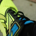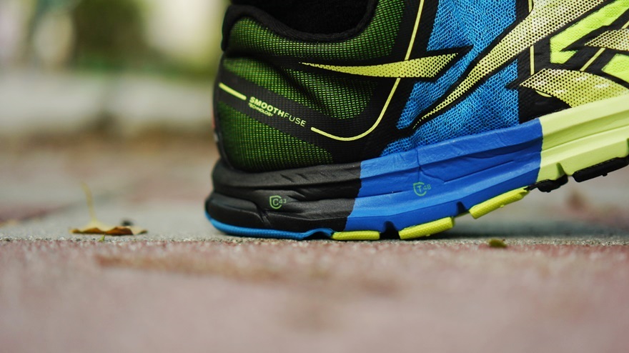 在評測的過程中當然除了主要性能也會有一些其他的小發現,鞋面布料用的多了些,以至於彎曲時會折向腳趾頭 (圖一),我個人沒有甚麼不適的狀況,但有朋友反映有線頭頂到腳趾,這可能要在試穿時多注意,扁的鞋帶搭配扁鞋帶孔,鞋帶很容易就穿整齊了 (圖二),鞋面的布料在光線照射下就可以看出透氣性肯定不差 (圖三),這雙鞋腳跟的包覆跟帶腳性真是不錯,雖然作法傳統但是誰管它呢,有效才是最重要的 (圖四),12.9 度是指跑步時步幅的自然傾角,在鞋底上做了調整跑起來會省力順暢 (圖五),外底各區塊依照磨損容易度的不同也在軟硬上有微妙的調整,像藍色就是最硬的部分 (圖六)