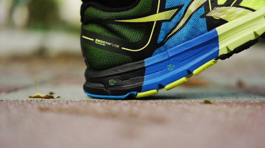一般來說腳跟是觸地時受到衝擊最強的區域,因此避震很重要,低密度發泡材質非常軟,落地時可以得到非常好的承托感,同時可以看到有劃出一塊緩衝區用作彎曲的空間,這塊區域面積也是最小的,避免穩定度不佳的狀況產生,另外在鞋面的部分腳踝跟鞋領的面料都用上較堅韌的素材編織而成,結實且能夠貼住雙腳,配合鞋領位置的厚身絨墊,既舒服又可鎖緊阿基里斯腱跟足跟,帶腳性更出色。