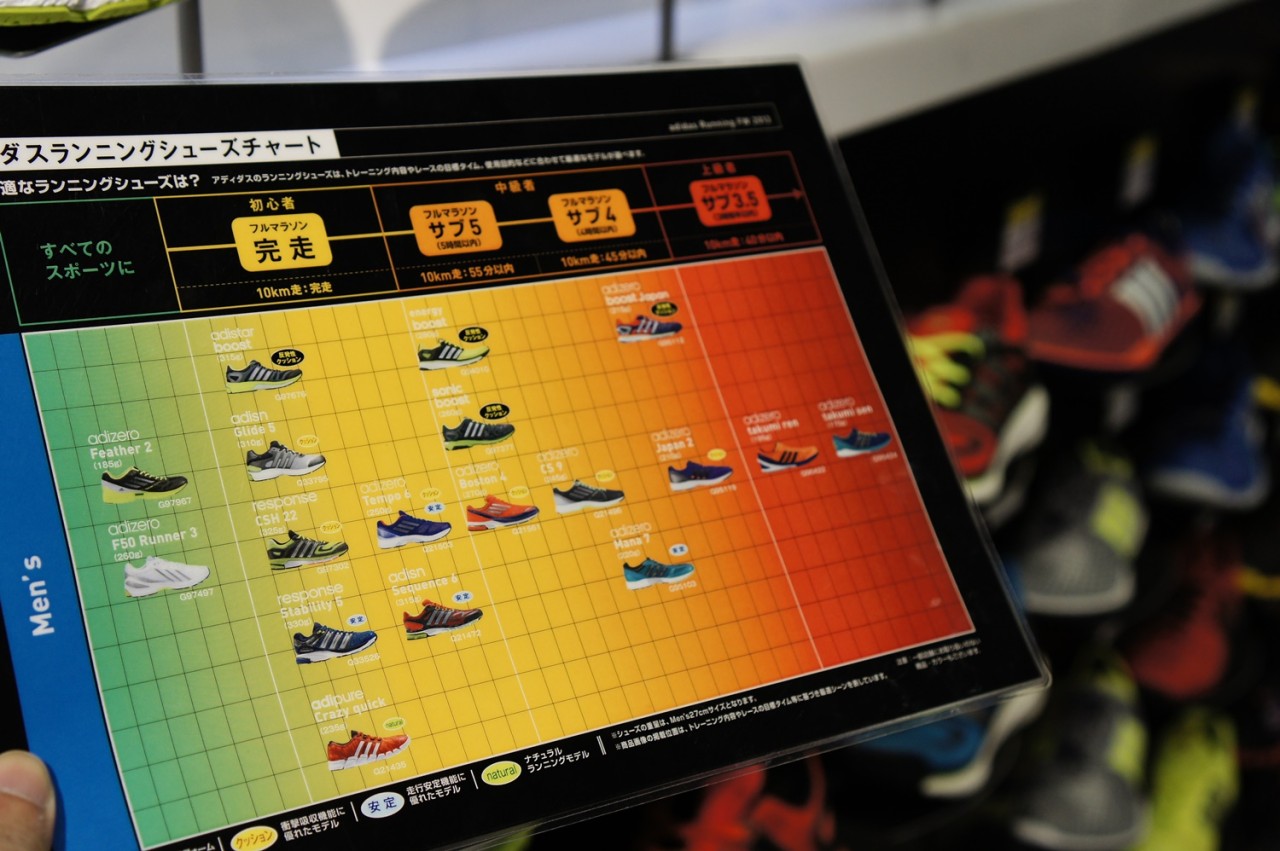 慢跑區可以看到一張說明,讓選購跑鞋的消費者依照自己的能力找到適合的鞋款,基本上是以 10 公里的完成時間來做區隔,可以看到最左邊是練習型的入門款式,但最右邊就能看到 adizero Takumi 系列,Takumi 系列推出後在日本有相當多的跑者給予正面的評價,我想這跟 adidas 既有的科技還有三村先生挹注的製鞋經驗相輔相成有很大的影響。