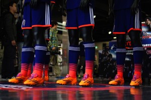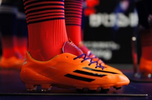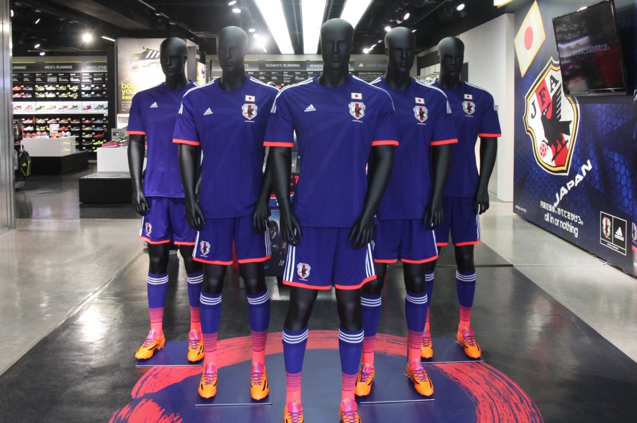 在門口迎接的是一字排開的全套國家隊穿搭,非常有氣勢!整套服裝設計的靈感來自於 “円陣” 帶來的信念,在各種運動都能見到選手圍成一圈強化意志,adidas 將這種精神力化為火焰,球衣背後一抹橘紅在日本隊圍出円陣之際會繞出無止盡的熊熊炙炎,是令人非常熱血的設計,而襪子跟鞋款承襲這個概念,選手上場彷彿雙腳燃燒,充滿能量,在官方影片中處處能看到這種概念的體現。