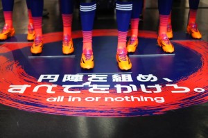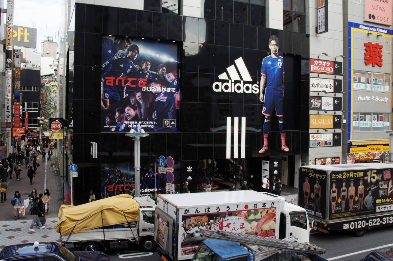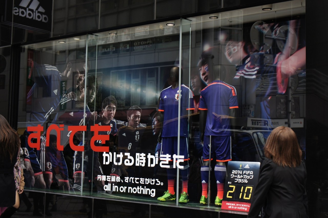 如前面所提,adidas 旗艦店座落於渋谷最熱鬧的區域,對面就是 109 百貨,隨時人潮熙來攘往,非常熱鬧,日本隊主力香川真司跟 adidas 希望傳達的訊息都清楚地展示於旗艦店的牆面上,其中 “all in or nothing” 非常有日本武士道的精神,讓人感到義無反顧的決心。