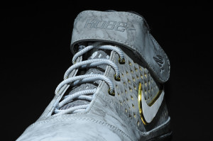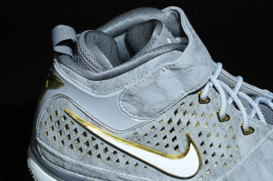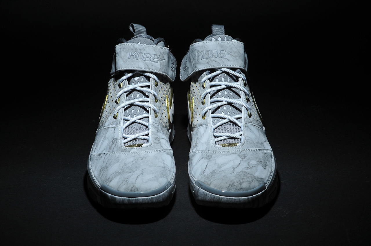Zoom Kobe 2 當年總共有三種型態,Zoom Kobe 2 Prelude 選用最均衡的 “ultimate” 版本 (另有強化包覆的 ST(Strenth) 還有輕量化的 LT(Light) 版本),來向 Kobe 當年寫下的神奇表現致敬,全鞋身採用灰色調短絨材質表現石材的紋理,用金色象徵榮譽,讓鞋子來紀念當年的重要時刻,這就是第二雙 The Kobe Prelude Pack 所想呈現的意象。
