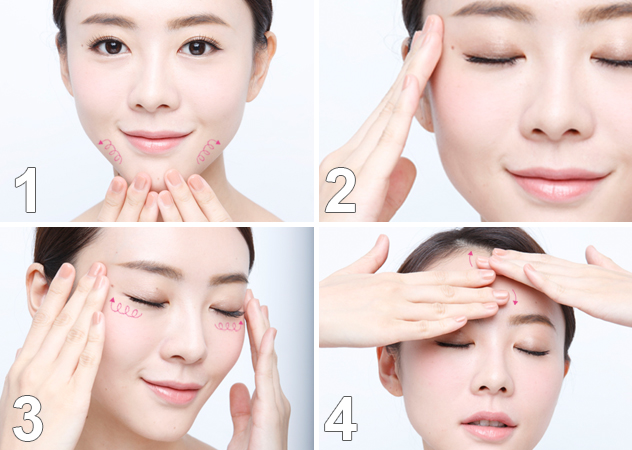 倒美容油於手掌,份量約是一元硬幣大小,塗抹整張臉。使用指腹畫螺旋,按摩臉部,方向是由內朝外。