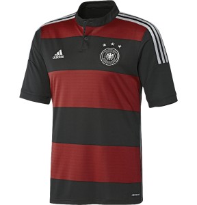 德國國家隊的客場球衣亦體現出德國隊的年輕化。紅黑相間代表了德國在球場上的傳統團結精神,其頸鈕設計和白色的肩紋的設計帶出由球場走到街頭文化,以表現出德國隊及年輕新一代所散發,難以抵擋的力量。