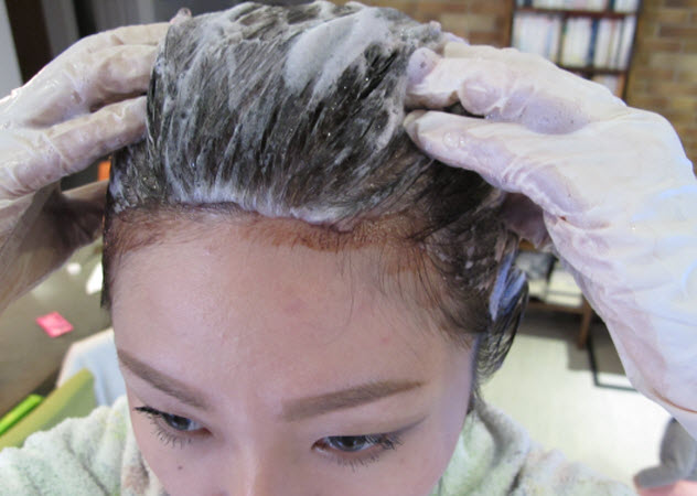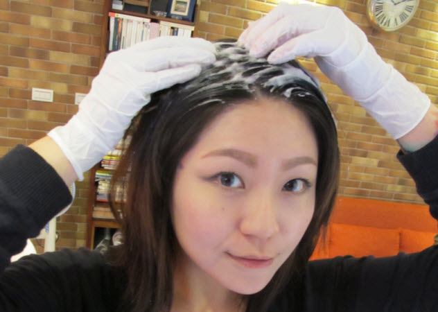 將大量的泡沫塗抹在乾髮上,接著用手指深入髮絲塗抹均勻,讓泡泡更加的綿密,避免染的不均勻,小編會分區塗抹泡沫,並且再用指腹搓揉,讓顏色吃得更進去。如果是中長髮女孩,記得披個毛巾,避免染劑沾到衣服。頭髮較長或髮量較多的女孩,可以使用兩盒染髮劑,泡沫量會更足夠,均勻包覆頭髮才能染出亮麗髮色喔!