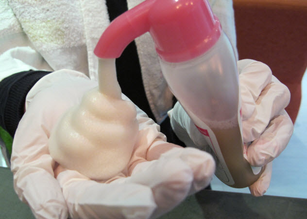 先將黑色瓶身的第一劑緩緩倒入白瓶身的第二劑混合,再上下180度慢慢來回翻轉瓶身約五次,不可以像搖泡沫紅茶般快速用力搖晃瓶身,若瓶子內產生泡泡,換上噴嘴後泡沫會不易擠出喔!接著戴上手套,輕輕按壓瓶身,泡沫就出來囉~染髮DIY開始!